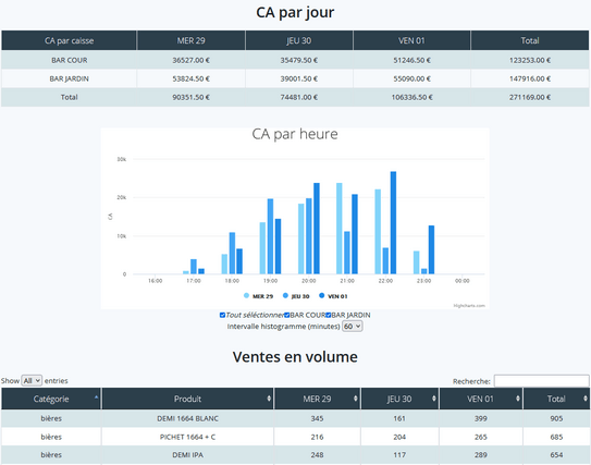 Les ventes remontent dans le back office et sont affichées en fonction du CA généré, du volume, du taux de TVA, du mode de paiement. Les clôtures de caisse ('Z') sont accessibles à la journée ou au mois.