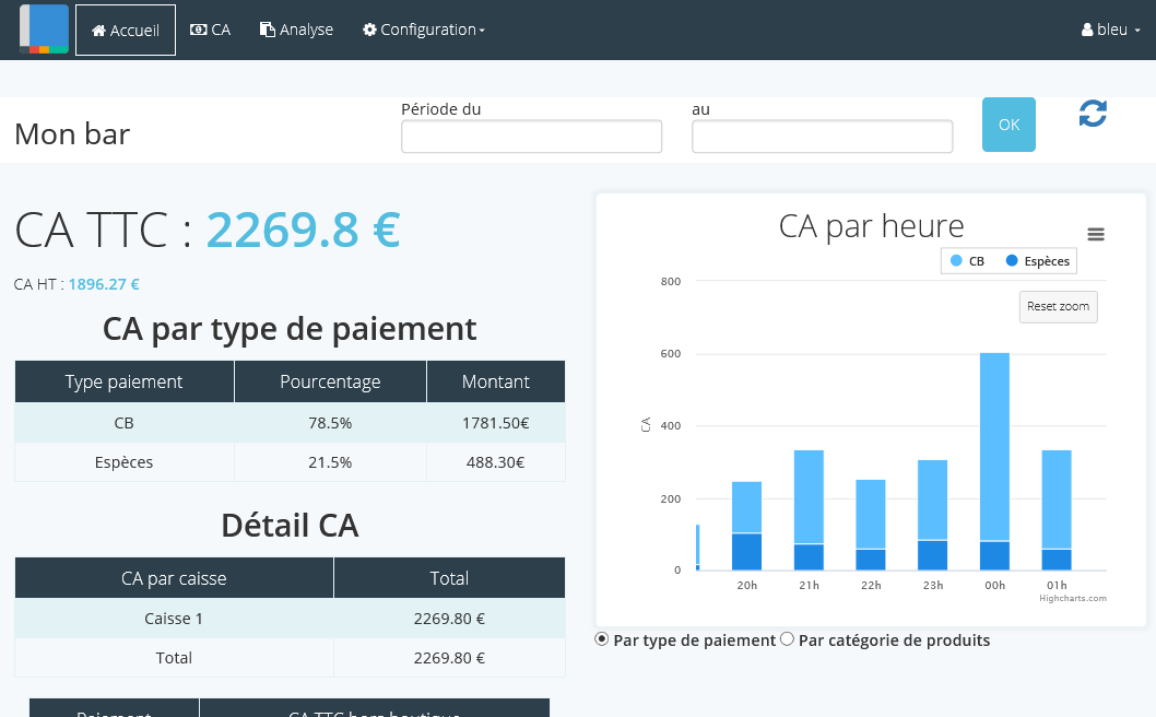 Les ventes remontent dans le back office et sont affichées en fonction du CA généré, du volume, du taux de TVA, du mode de paiement. Les clôtures de caisse ('Z') sont accessibles à la journée ou au mois.
